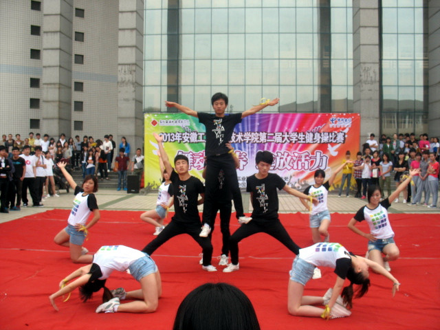 为纪念中国共产主义青年团建团91周年,丰富活跃校园文化,增强大学生体质,展示当代大学生的精神风貌和形象气质,提升青年人时尚、活力、健康、自信的人生理念,根据第七届科技文化节安排,学院“第二届大学生健身操比赛”于5月10日下