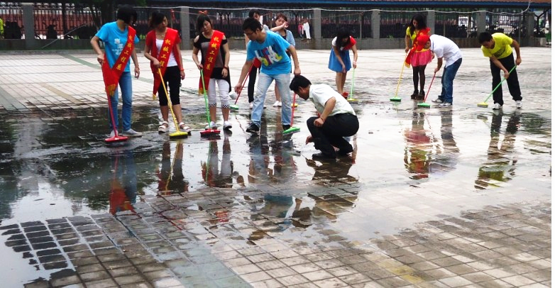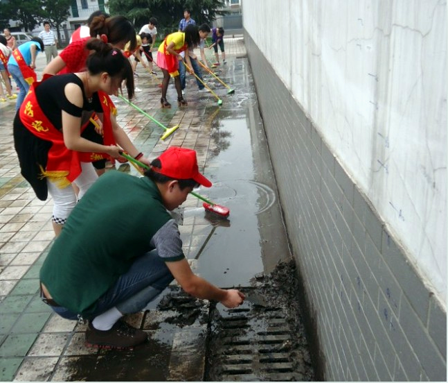 当天虽然天气炎热,但同学们都争先恐后的拿着工具进行地面清扫。活动中,很多同学的鞋子都被污水弄脏了,但并没有因此停下手上的工作。总务处、机械工程系相关领导和老师都参加了此次活动,拿起扫把,和同学们一起埋头苦干。