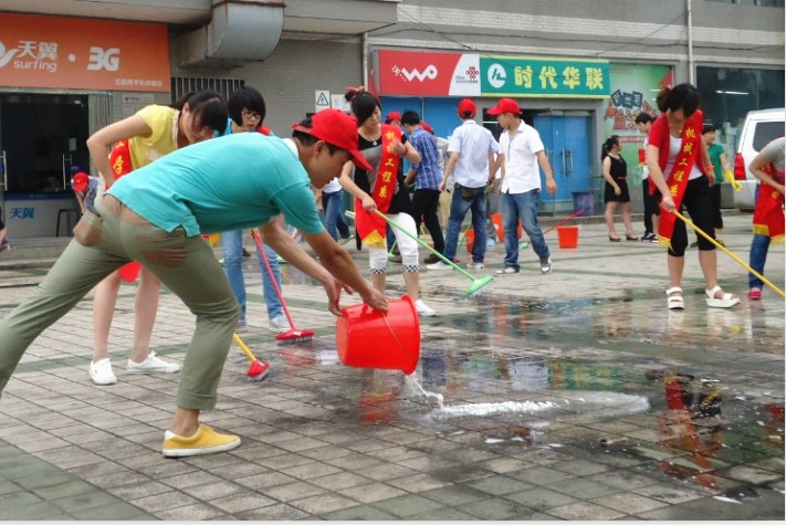 活动接近尾声时,天空下起了倾盆大雨,但大雨没有浇熄同学们的热情,大家仍然坚持完成了全部地面的油污清理工作。在大家的共同努力下,三食堂楼前的地面又重新恢复了原先的光洁和明亮。最后,大家在雨中进行了合影,此次活动圆满结束。