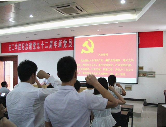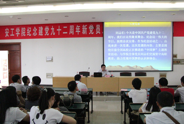 今年是中国共产党建党92周年,为进一步加强党组织建设和党员队伍建设,增强党组织的凝聚力和战斗力,激励党员坚定理想信念,坚守精神追求,学院于6月28日下午,在阶梯教室201开展了庆祝建党92周年新党员入党宣誓暨党课教育活动。学院党委书记石小河、常务副院长李庆峰、副院长马平、副院长周理瑞、学院全体教职工党员、2013春新发展的学生党员出席了此次活动。活动由副院长马平主持。