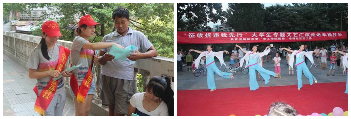 经过精心筹划,秉承体现专业特色、贴近群众需求的原则,第一支实践团队来到了铜陵市幸福社区开展以“美丽中国·美好铜陵”为主题的群众路线教育实践。实践内容重点结合铜陵市年度中心工作——征迁拆违开展。在坚持以“拆违促拆迁”的工作思路下,营造城市建设发展和谐的建设环境,实践团队深入城区开展了“政策解释、宣传通告、入户访问等宣传行动。志愿者们发放了《征迁拆违政策法规宣传册》、《通告》等宣传资料,并积极向群众讲解拆迁政策、拆迁优势、违章建筑安全隐患等群众关心的问题。20日晚间,由实践队成员自编自演的一场名为“征迁拆违我先行”大学生专题文艺汇演在社区广场举行,学生们精彩的表演赢得了观看群众们的阵阵掌声。