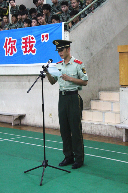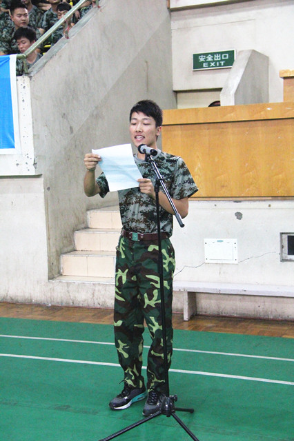 武警支队三中队队长、13级电气工程系学生舒文峰分别代表军训教官和2013级新生发言。
