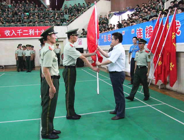 开学典礼在庄严的国歌声中拉开帷幕。学院党委书记石小河代表学校向负责本次军训的武警支队三中队教官授予了军训旗。