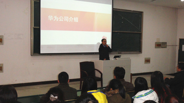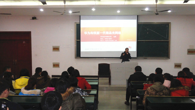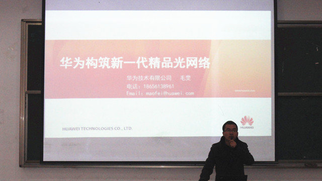 讲座当天,网络技术专业的师生早早来到教学楼101阶梯教室里,安静的等待工程师的到来。2:30讲座正式开始,刘志峰工程师首先介绍了目前华为网络有限公司的基本情况和主营业务,接着介绍了公司的主要网络产品和核心交换机等网络设备;毛斐工程师详细介绍了华为公司的骨干光纤网络技术;最后合肥龙旭网络技术有限公司的金哲龙总经理给同学们介绍了目前网络技术专业的就业现状及职业规划。