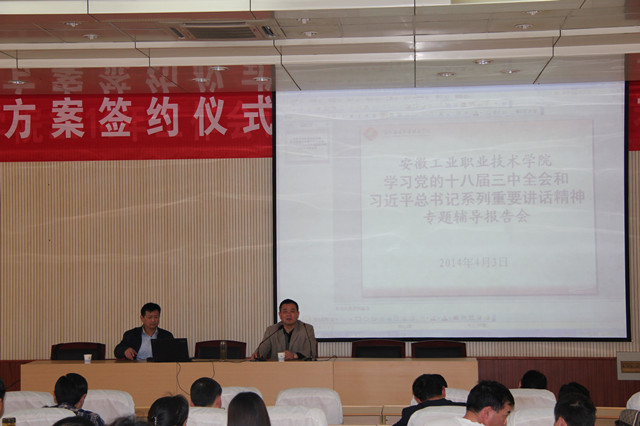 报告会由副院长马平主持,报告会上资源开发系书记钱曙东、人政部副主任范清义、学院党委书记石小河分别对十八届三中全会精神、习近平总书记系列重要讲话精神、安徽省高校领导干部轮训班精神进行了宣讲,全校两级班子成员、各系团总支书记、专兼职辅导员、学生工作秘书以及基础部思政理论课教师参加了学习。