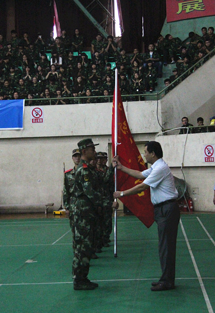 学院党委副书记马平代表学校向负责本次军训的教官授予了军训旗。