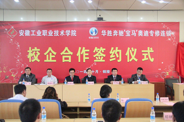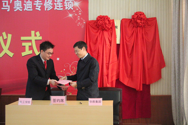 10月17日,学院与华胜集团举行校企合作签字揭牌仪式,开班培养汽车维修专业技术人才,进行订单式培养。学院院长陈世虎、常务副院长李庆峰、副院长马平、华胜集团总裁周大军、华胜集团南京区域总经理李长华、华胜集团南京区域行政经理金琴、华胜集团无锡新区店总经理兰培杰、华胜集团宜兴店总经理孙建、华胜集团常州店总经理吕东及学院各部门各系部主要负责人、有关教师和辅导员、部分汽车专业学生代表出席了仪式。
