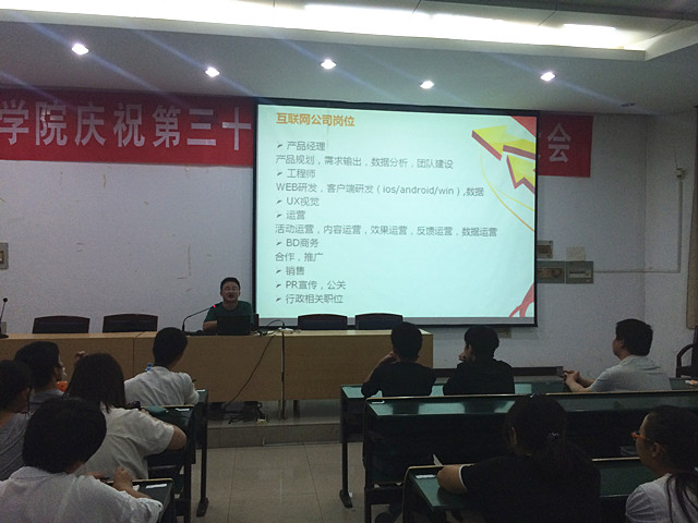 9月29日晚19:00,王伟先生在beat365教学楼201阶梯教室为信息工程系两百多名同学开展了主题为《IT行业&职业发展》的专题讲座。王伟先生依据自身在IT行业打拼多年的经验,向同学们介绍了目前主流的IT行业企业的运营方式、人才需求状况,重点对移动互联网企业的公司架构、职业岗位、应用技术、薪资待遇等方面做了详细的介绍,并对当前计算机类高职大学生就业方向、职业成长规划、如何培养和提高职业能力等方面进行了分析与总结。讲座后,王伟先生主动与现场的同学互动交流,对同学们在专业学习和未来职业规划发展方面的遇到的困惑和问题予以一一解答。