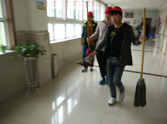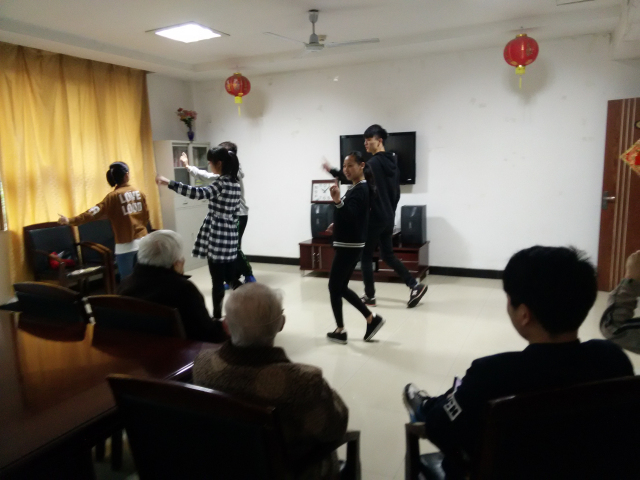 志愿者到达时,正值敬老院打扫卫生的时间,志愿者迅速加入到打扫卫生的队伍中去,帮助护工一同打扫整栋公寓。之后,其他志愿者前往各个房间探望老人。在探望过程中,志愿者们给老人们送上了新鲜的水果和牛奶,为老人整理房间、陪老人聊天、打乒乓球、为他们表演唱歌,跳舞等。现场老人们对生活乐观的态度、灿烂的笑容深深地感染了在场的每一位志愿者。