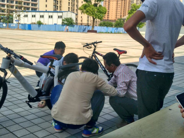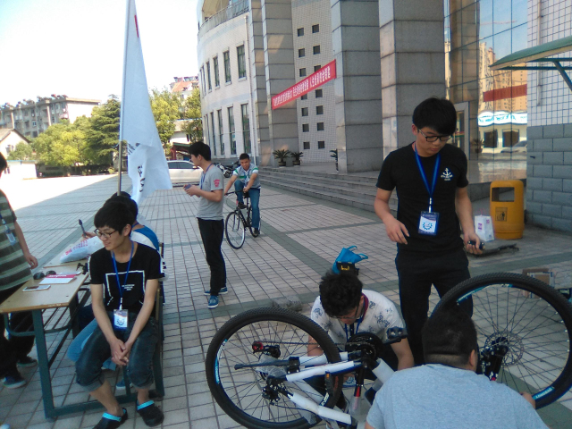 下午2:30,教学楼前维修社的同学们树起了社旗,每人胸前挂好了胸牌,维修工具也准备就绪。活动伊始,就有很多同学前来维修自己的自行车。维修小组的成员们耐心询问车主自行车的损坏情况,对前来维修的同学进行了登记,并对损坏的自行车进行了检查与维修。活动一直持续到下午4:50,短短两个多小时时间里,维修社成员们共完成了17辆自行车的维修。