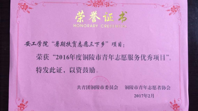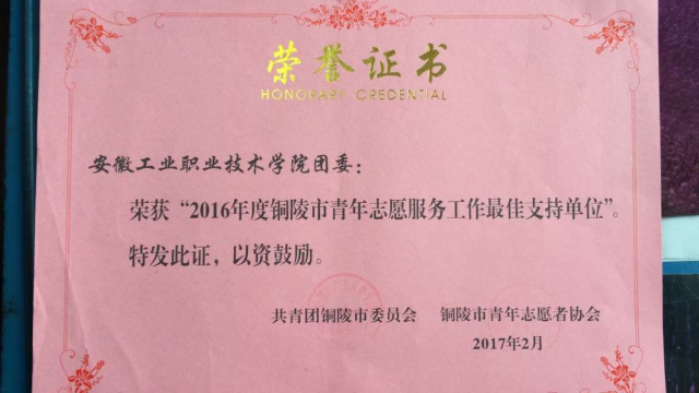 近日,学院团委再度荣获市级志愿服务多项荣誉。beat3652名在校大学生荣获“2016年度铜陵市优秀青年志愿者”称号;“青春建功十三五·精准扶贫奔小康”大学生暑期三下乡荣获“2016年度铜陵市青年志愿服务优秀项目”称号;院团委荣获“2016铜陵市青年志愿服务工作最佳支持单位”称号。