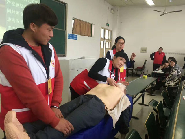 活动中,红十字会的专家为学生们详细讲解了心肺复苏、创伤救护、排除气道异物、重大交通事故、触电事故以及溺水事故的急救处理方法和自救互救技能,并在现场进行了实际操作演示,如互相做创伤救护、止血包扎练习、模拟人心脏复苏操作等,同学们积极配合红十会专家进行演示。