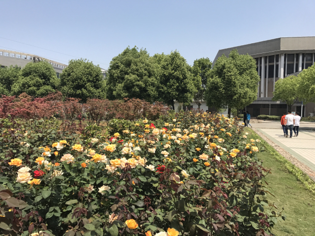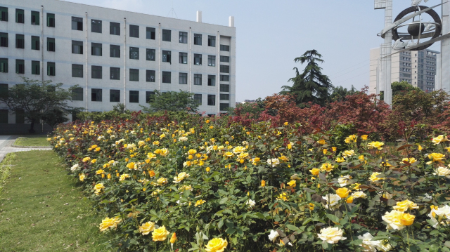 正值春意盎然的时节,樱花盛开,柳絮翻飞,学院教学楼广场西侧月季园里,万朵月季花竞相开放,展示着她的惊人艳丽。