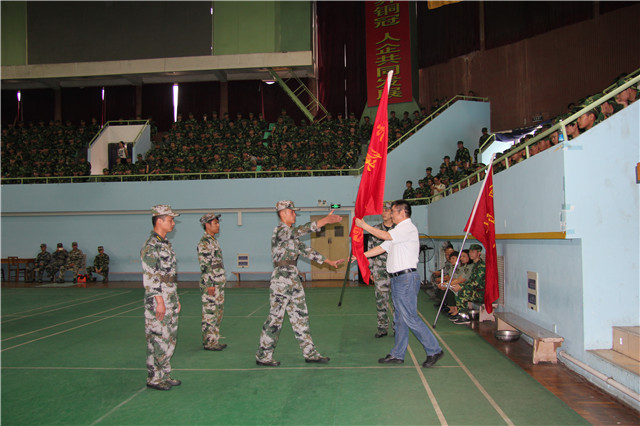 学院党委书记石小河代表学校向负责本次军训的武警支队教官授予了军训旗。