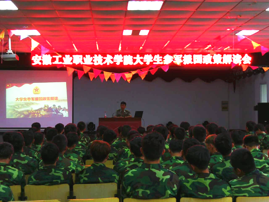 9月20日上午,一场主题为“大学生参军报国政策解读”的活动学院图文中心六楼大学生活动中心举办。铜陵市军分区动员处处长刘小兵在大会上为新生们详细讲解了大学生参军的必要性和重要性,并就大学生入伍激励政策进行了解读。此次动员大会让同学们进一步意识到参军报国是现代大学生义不容辞的责任,是报效祖国应尽的义务。(稿件来源:武保部)