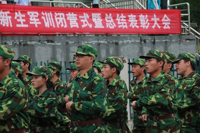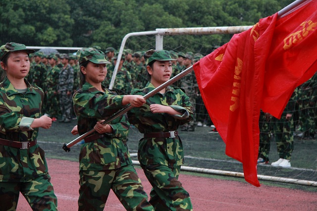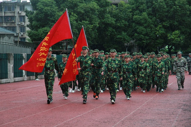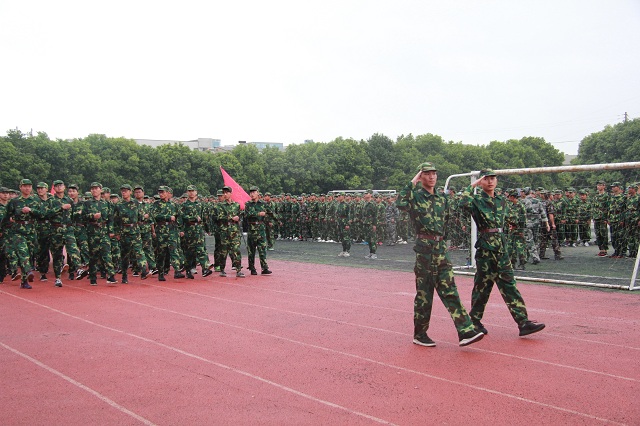 闭营仪式在庄严的国歌中正式开始。伴随着雄壮的解放军进行曲,全体新生进行分列式汇报表演。经过为期六天的军训,新生在纪律、体魄、精神等多方面得到了良好的训练。阅兵式上,虽然雨越下越大,但同学们仍然军容整肃、精神抖擞、英姿飒爽、动作整齐划一。雨水一滴一滴、一串一串打湿了衣服,顺着紧握的双拳点点落下,但没有人去擦,没有人退缩,新生们用军人般坚定的意志克服天气阻碍,用坚毅的脚步和铿锵的口号阐释了不屈的军魂,彰显了安工学院大一新生积极向上的精神面貌。