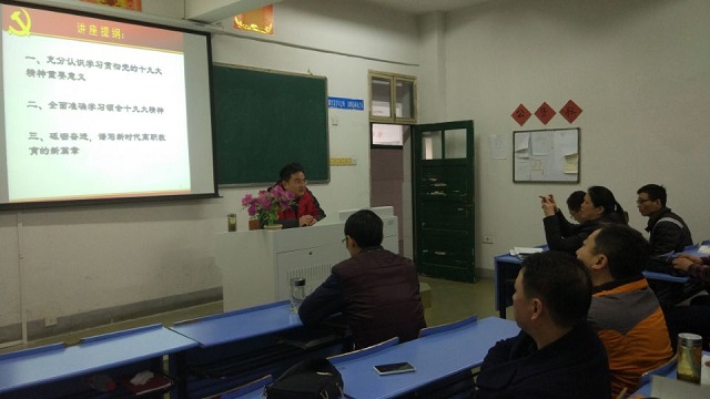 本次宣讲的主题是《准确领会十九大精神,谱写新时代高等教育的新篇章》。宣讲中,陈院长带领大家系统学习了十九大报告的主要内容,详细解读了十九大报告中的新思想、新论断、新提法和新举措,十个“深刻领会”为大家指出了十九大精神学习的方法和要求。他在宣讲中提出,学习是一个长期的过程,全体党员和教职工要做到“读原著、学原文、悟原理”,要把学习好、宣传好、贯彻好十九大精神作为当前首要的政治任务,要真正学懂、弄通、做实。