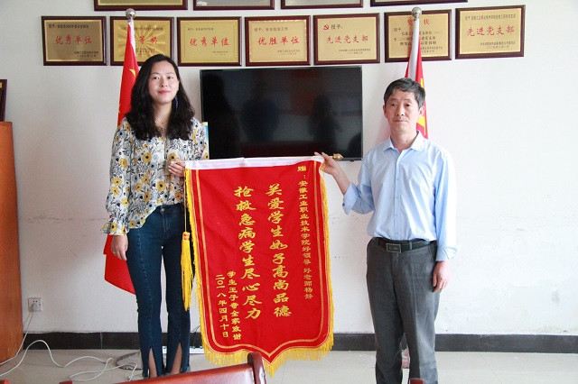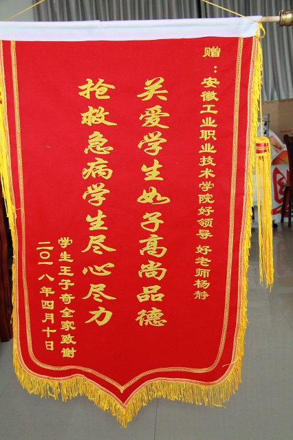 王子奇同学康复出院后,学生家长满怀感激之情,寄来了一面锦旗,感谢学院的好领导好老师,感谢杨老师为学生的辛苦付出。