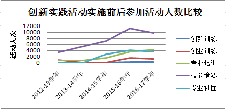 开展创新实践活动三年多来,共组织各类与专业有关的第二课堂活动1620项次,较改革实施前的两年平均每年增加481项次;参与各类活动的学生共52016人次,较改革实施前的两年平均每年增加13525人次。
