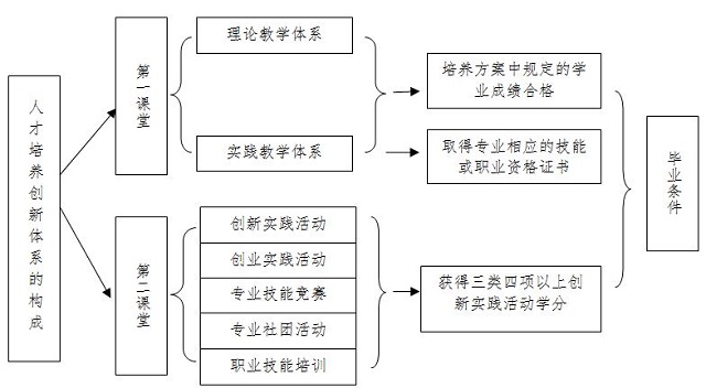 人才培养体系改革贵在创新。传统的人才培养体系仅仅关注第一课堂,新的人才培养体系建立以人才培养方案为指导文件的第一课堂培养和以创新实践活动为主要内容的第二课堂培养相结合的一种新的培养模式。第一课堂培养着力使所有学生掌握本专业最基本的知识、技术和技能。第二课堂培养着力引导更多的学生积极参与创新实践活动,使学生有选择地在专业综合能力、综合素质方面有新的提升。