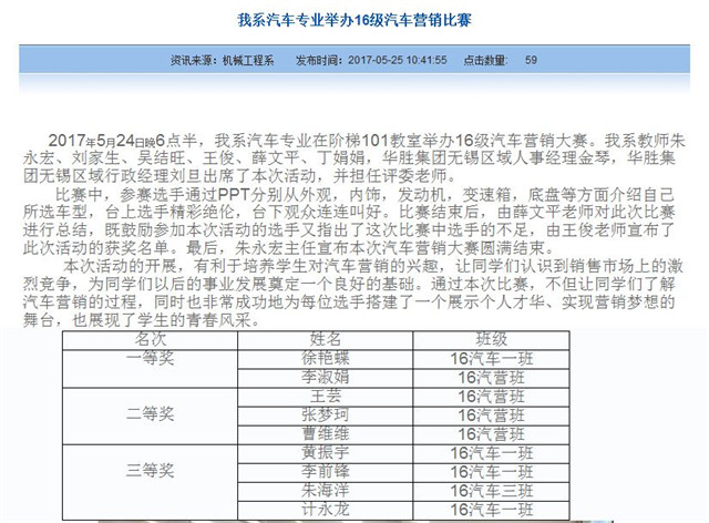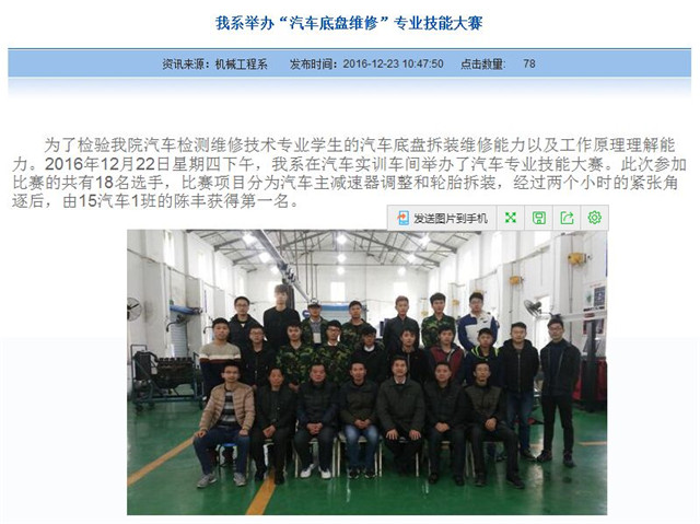三年来,学院组织各系开展了动画多媒体制作、汽车故障诊断与维修、汽车营销技能、机械制图手工绘图、电气控制与PLC、电子产品焊接与调试、化验操作技能、化工管路拆装、工业生产操作技能、工程测量职业技能、斯维尔BIM建模、物流公路运输方案设计、大学生英语口语、应用数学等等专业技能竞赛246项次,约有28420人次的学生参加。较改革实施前的两年(2012-2014学年),组织竞赛平均每年增加32项次,学生参与平均增加4025人次。