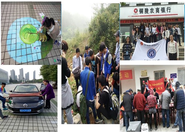 周末的早晨,体育馆门前,资源系物华标本社的同学已经整装待发,他们将在指导老师的带领下,再次登上巍巍铜官山,认知地形地貌、收集岩石标本;精确测量社的同学也拿着各种仪器,忙碌在校园的各个角落;在艺术设计工作室,信息系的大学生艺术设计社团的同学也在忙碌,利用自己的专业技术为各社团设计社徽和社旗,绘制校园海报,制作校园文明宣传标语;计算机网络社团的同学正在教室里聚精会神地聆听一位IT专家的讲座;在五松新村社区门口和居民家里,电气系的家电维修社团和零度制冷社团的成员们正满头大汗,一丝不苟地为社区居民义务维修日用小家电、免费检测空调、宣讲用电安全常识;机械系的汽车维修与服务社团在校园内开设服务店,为学院教职工和附近居民进行车辆保养和保洁服务,天工维修社的同学积极为同学们免费维修自行车;管理系会计社团到银行向广大储户介绍储蓄知识,扬帆营销社团开设“跳蚤”市场,销售学生所需的生活物品,小草电商社开设网店销售学生家乡的土特产品……