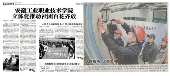 丰富多彩的社团活动、广泛的专业技术技能应用的专业服务,锻炼了社团学生的专业应用能力、增长了社团学生团结协作精神和为民服务的意识,得到了校内外的好评,也引起了新闻媒体的关注,安徽青年报、铜陵日报、铜陵网等多家媒体为此作了专题报道。(稿件来源:汪志峰、刘春友 )
