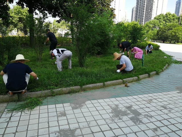 活动中,总务党支部全体党员和入党积极分子在总务处院内集中,穿戴好手套和草帽等劳动保护用品,来到教学楼旁绿化带整修树苗、拨除杂草。天气炎热,不一会大家都汗流浃背,但任然坚持完成任务。