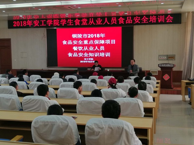为加强食品安全监管,提高食堂从业人员食品安全意识,10月16日,学院总务处在教学楼阶梯教室301举办了食堂从业人员食品安全培训会。