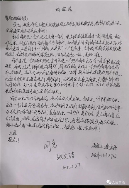 正如他的字里行间所说,满满的战友深情,夹杂刻骨铭心的新训时光,一直烙刻在心头。吃不够的当兵苦,忘不掉的战友情,相信这是世上最为情谊绵长的请假条。