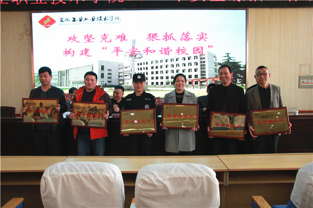 学院纪委书记、工会主席周理瑞在会上宣读了表彰决定,授予机械工程系机加工实训中心、电气工程系PLC实训室、资源开发系基础化学实训室、信息工程系综合布线实训室、总务处第二学生食堂、武保部校园秩序巡逻队六个单位“安全模范岗”荣誉称号,并颁发了奖牌。学院院长陈世虎分别与各部门、单位负责人签订2019年度安全、综治、信访责任书。