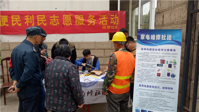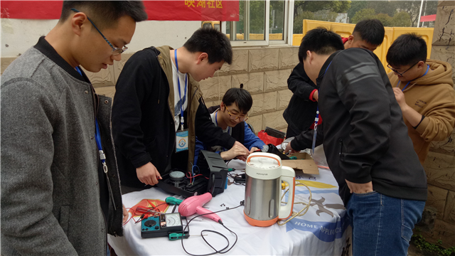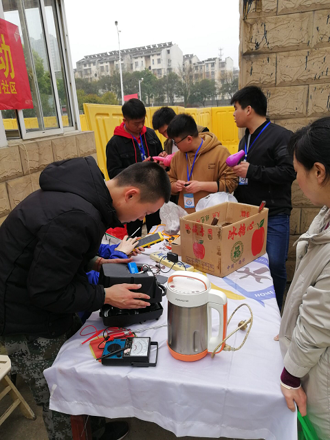 活动前期,社团指导老师和社区有关负责人进行了前期沟通和活动宣传,活动当天,当同学们到达活动地点时已有许多居民带着电器早早等待。活动开始,同学们分工明确,找问题、查故障,修理了多种家用电器的常见故障。对一些较难解决的问题,同学们也在指导教师指导下尝试修理。整个活动进行了四个多小时,免费为居民维修家用小电器20余件,大部分电器经过同学们的维修都能正常使用。见到变废为宝,重新发挥作用的小家电,居民们一个个喜笑颜开。