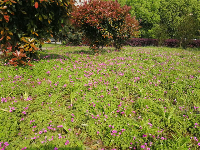 健身房门前,第二行政楼前、雕塑西面,地被植物红花酢浆草,开出了成片的小花。