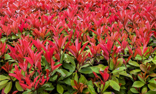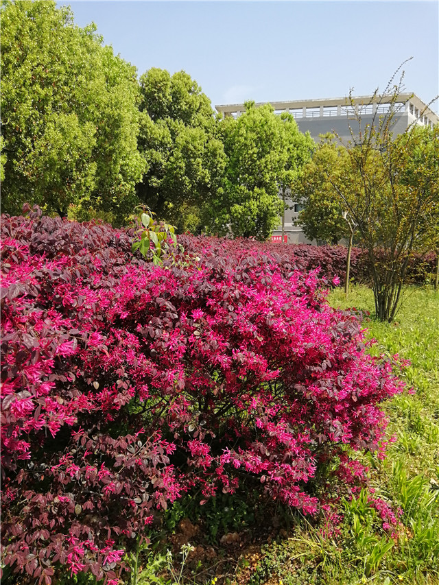 体育馆周围、经二路东边、工业技能中心周边大片红花檵木形成的灌木丛,整齐的红叶中开满鲜红色丝状花。