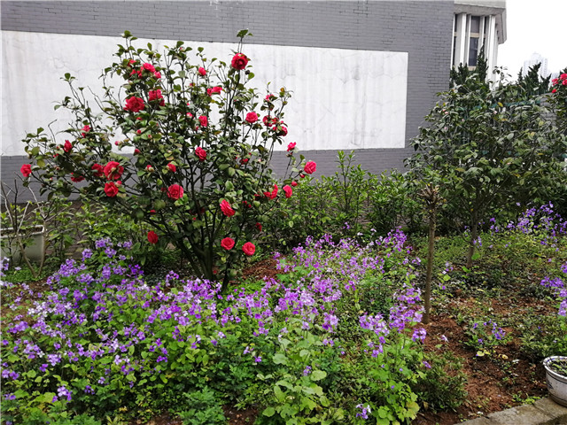 7号楼院内盛开着二月兰,成片的蓝紫色花耀人眼目。