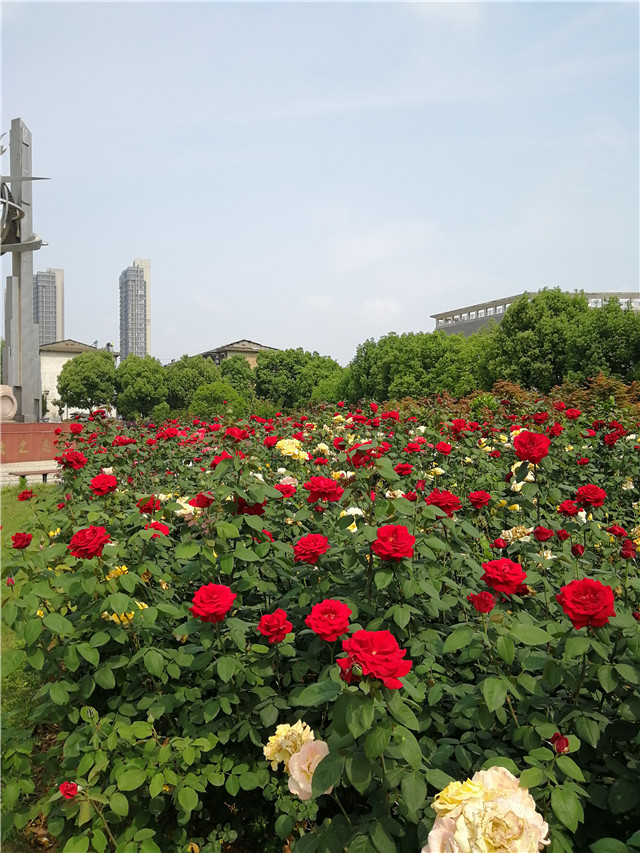教学楼广场西侧、生活区中间地带,共7000棵大花香水月季,以黄色、粉色、红色为主,花期从4月至11月,花朵硕大,盛开时,满眼花朵恣意开放,微风吹来,香味沁人心脾。