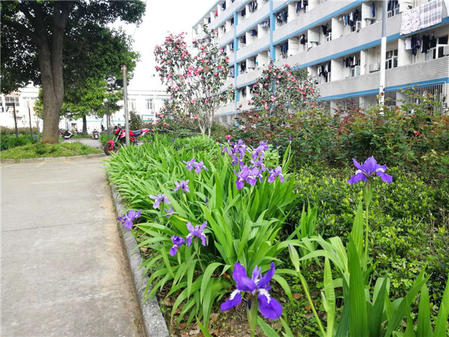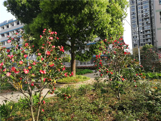 到了鸟语花香的春天,教学楼广场西边、生活区绿化带里,盛开着茶花。