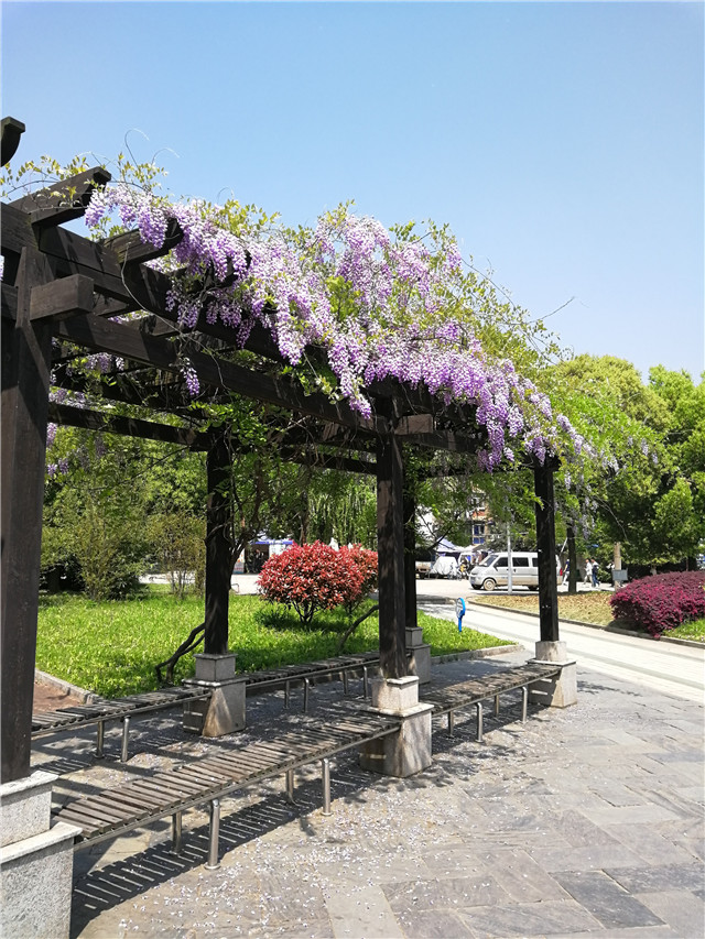 学思园廊架上的紫藤,挂满鲜亮的紫色花穗。