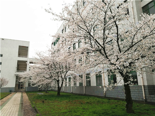 教学楼边樱花园内的樱花,花瓣轻盈淡粉色的是早樱,重瓣似球形的是晚樱。