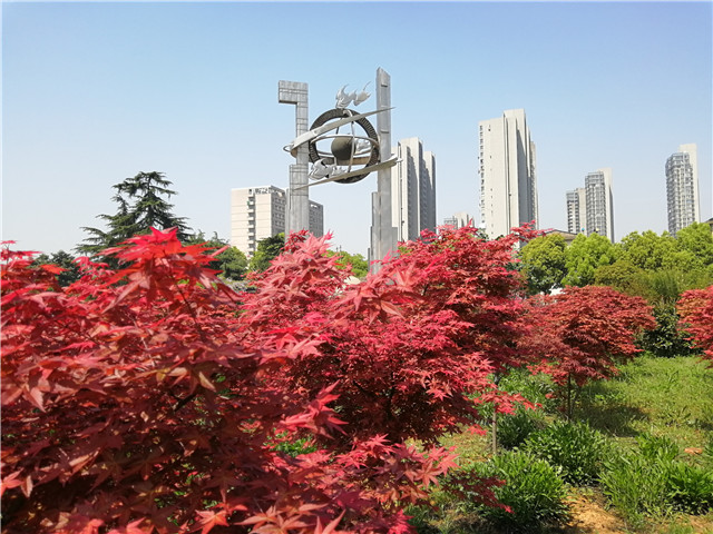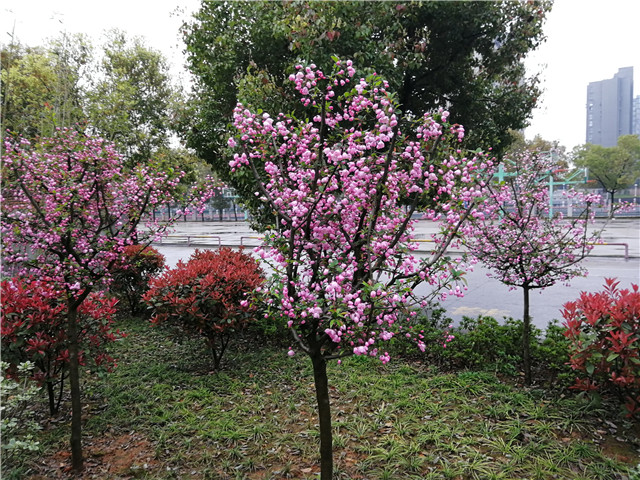 教学楼广场西侧红枫林,春天的红枫叶象一片火。生活区四栋宿舍楼周边、第一行政楼周边等处的红叶石楠,春天新发的红叶。红枫和红叶石楠不是红花胜似红花。