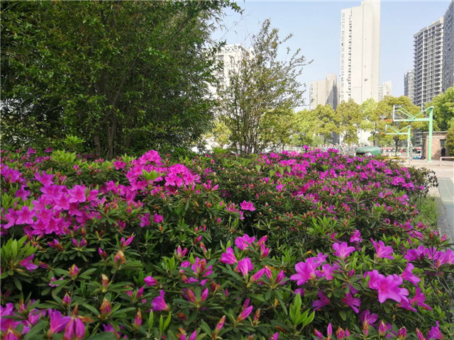 教学楼西门前、学思园廊架边、纬二路与经二路交汇处怒放的毛杜鹃。