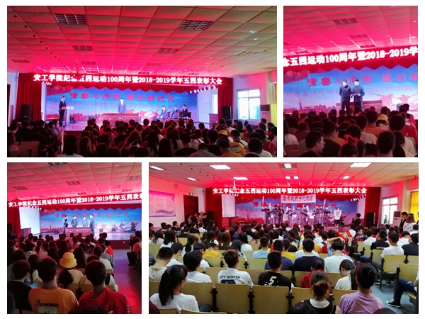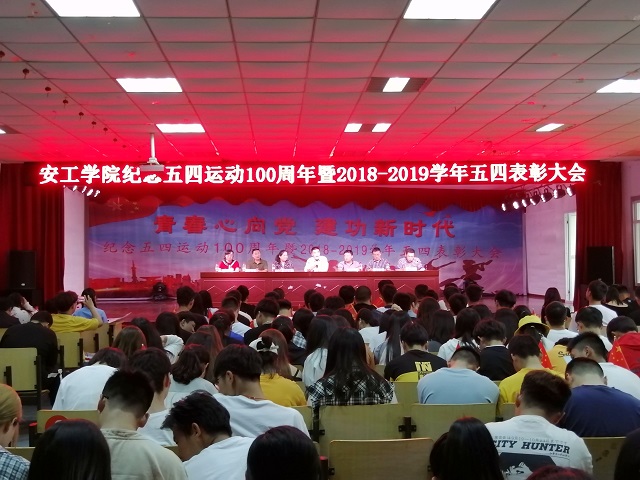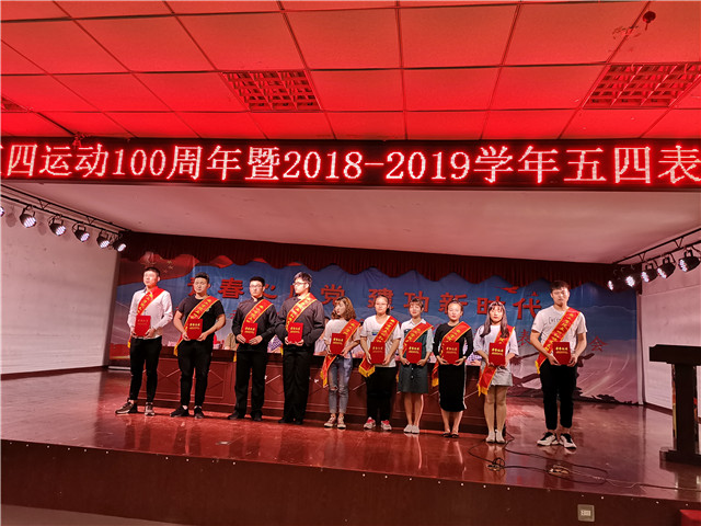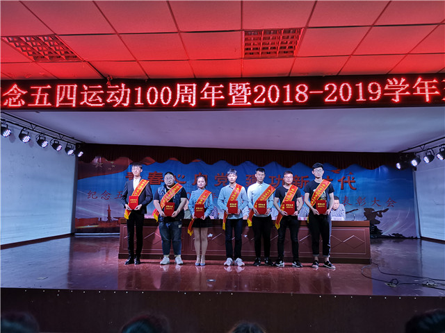 表彰大会在雄壮的国歌声中拉开序幕。团委工作人员宣读《关于表彰2018-2019学年“五四”先进集体和个人决定》,对在学院共青团工作中表现突出的先进集体和个人进行了表彰,出席会议的领导依次为获奖者代表颁奖。三名学生代表作为受表彰集体和个人先后发言,分享了他们在前进路上的工作经历和感人故事,抒发青春心向党、建功新时代的豪情。随后全体与会人员面向国旗,接力宣誓,致敬五四100周年。