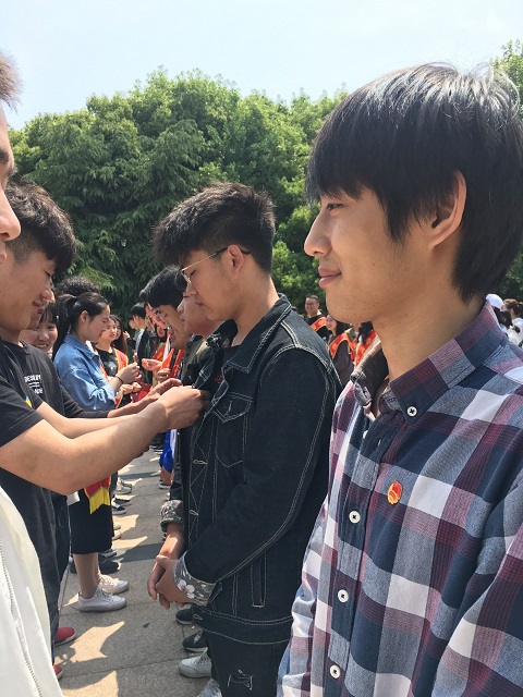 活动中,各系团员代表在团旗下作主题演讲,抒发了对革命先烈们的缅怀敬仰之情,并表示要坚定理想信念,勇于担当,用实际行动绽放青春风采。接着,老团员为新入团团员佩戴团徽,全体人员面向团旗,重温入团誓词。