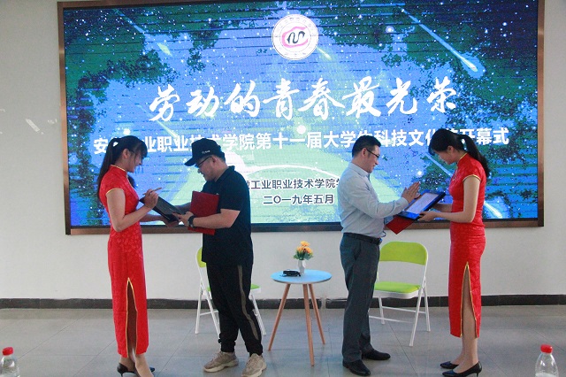 第十一届大学生科技文化节组委会主任李庆峰在开幕式上致辞,充分肯定大学生科技文化节作为校园文化内涵的外在表现形式和有效载体,为安工学子展示独特个性与魅力风姿提供了青春的舞台。随后,组委会副主任周理瑞向在场师生介绍了本届科技文化节实施方案。在随后的嘉宾访谈环节中,学生主持人与现场两位嘉宾进行了面对面访谈。两位嘉宾分别分享了他们的成长经历和工作经验,精彩解读了劳动价值与工匠精神的内涵。