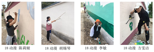 师生们一到会宫镇,顾不上舟车劳动,立刻投入到紧张的工作当中。王阳明曾经说过:做一件事情之前,充分准备好前期的事情,才能百战百胜。在墙绘的准备阶段,从材料到测量墙的尺寸,同学们在老师的带领下,有条不紊,做足了准备。在彩绘现场,他们进行了细致的策划和分工,起型勾线、收集材料、调制颜料,大家分工明确,各司其职,干得不亦乐乎。经过13天的努力,文化墙最终大功告成,看着自己辛勤创作出的作品,同学们体会到了乡村墙绘的乐趣,同时也在实际操作中找到了自己的长处也发现了自己的缺陷。