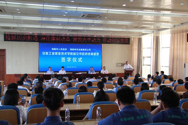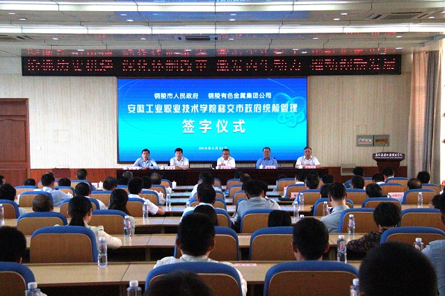 上午8时30分,安工学院移交市政府统筹管理签字仪式,在安工学院教学楼301学术报告厅举行。市长胡启生,市委常委、常务副市长程双林,铜陵有色公司总经理龚华东,副总经理徐五七等有关领导出席。移交仪式由市政府秘书长周剑主持。
