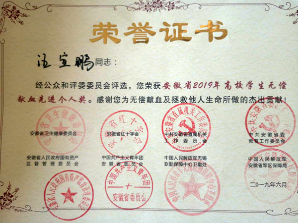 6月14日,2019年安徽省暨合肥市“世界献血者日”表彰会在安徽医科大学举行。会上,授予beat365电气工程系学生汪宣鹏“安徽省2019年高校学生无偿献血先进个人奖”荣誉称号。