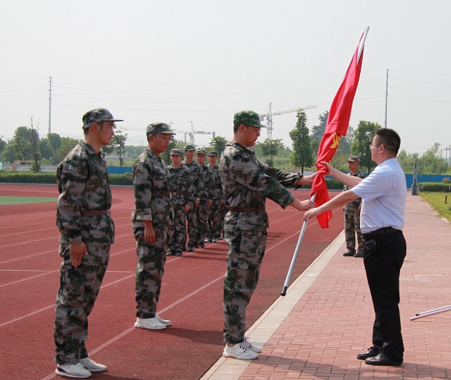 随后,学院党委书记石小河代表学校向各系授予了军训旗。