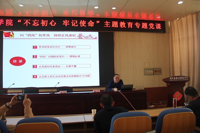 蒋宁主任以《纠“四风”转作风,持续正风肃纪》为题,从作风建设金色名片越擦越亮、“四风”问题隐形变异警惕反弹、正风肃纪任重道远长抓不懈、在日常工作生活中要注意的若干问题等四个方面做了关于党风党纪的讲授。蒋主任结合自身学习体会,详细介绍了我党深入贯彻落实党的十九大精神和习近平总书记关于进一步纠正“四风”、加强作风建设的重要批示精神,进一步推进党风廉政建设和反腐败工作的一系列举措。他指出,党风廉政建设永远在路上,一刻也不能松懈,每位党员同志都要把政治纪律和政治规矩摆在首位,对约束和监督有正确而清醒的认识,正风肃纪,保证学院风清气正。