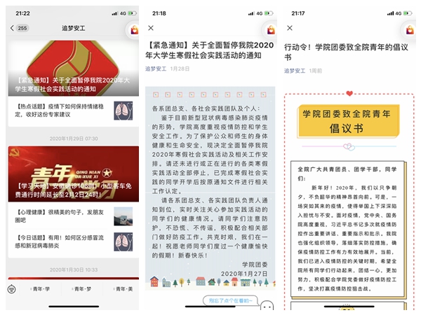 工作调整有速度。鉴于新型冠状病毒疫情的形势,对寒假相关工作安排做出调整。1月27日,印发《关于全面暂停beat3652020年大学生寒假社会实践活动的通知》,明确要求全体学生,立即暂停寒假社会实践活动,确保师生健康安全,消除潜在的病毒传播隐患,开学后通过日常实践补充相关工作,保证学生学分资源。2月6日,发出《行动令!学院团委致全院青年的倡议书》,引导我院学生正确对待当前疫情形势,坚定抗疫信心,做到顾大局,听安排、不恐慌、不轻视。